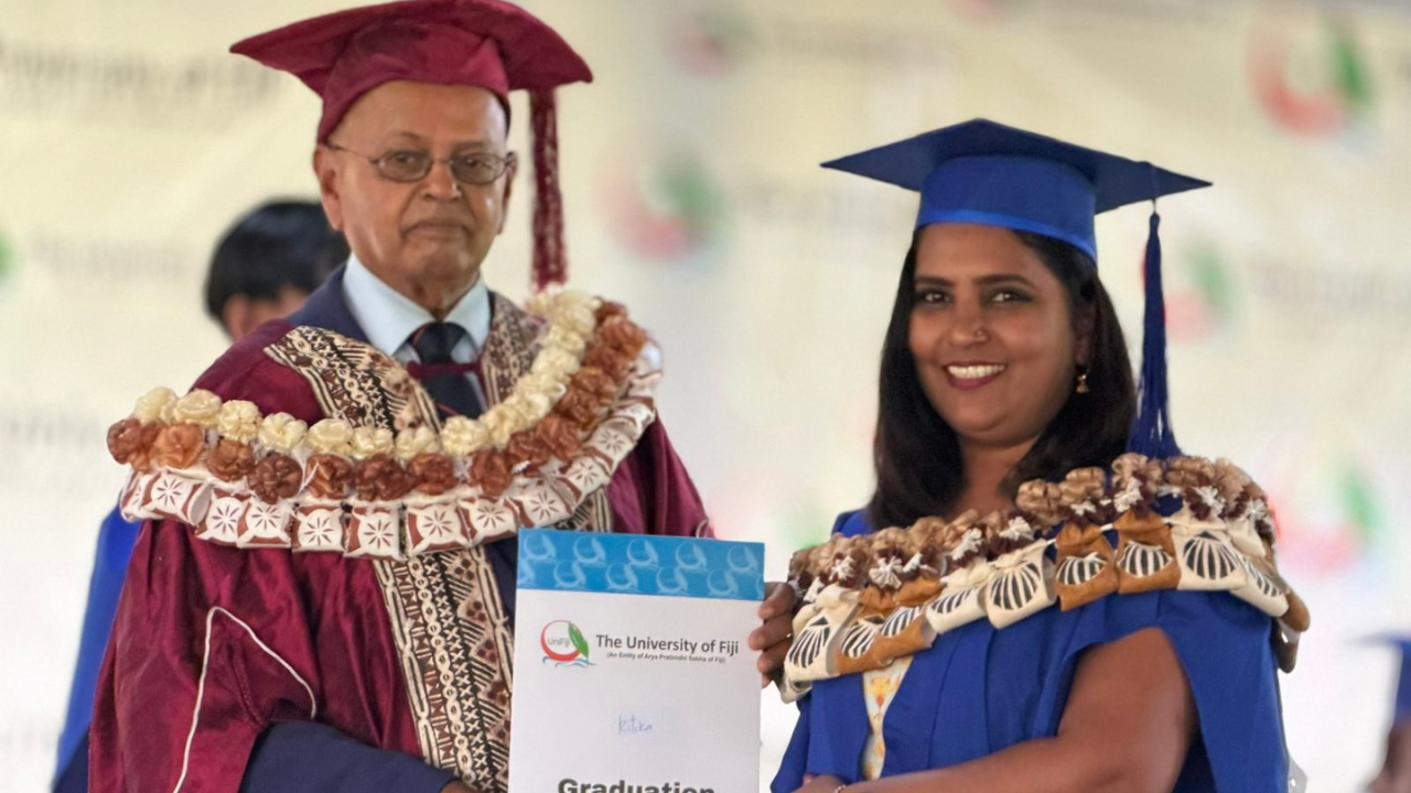 FBC Manager News, Ritika Pratap, receives her certificate during The University of Fiji’s graduation ceremony early this morning.