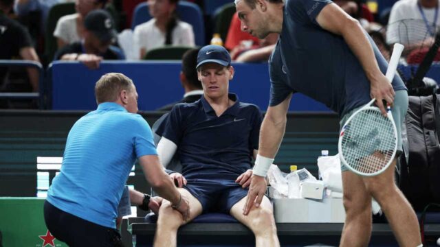 Jannik Sinner’s bid to retain his Shanghai Masters title ended in agonising fashion on Sunday when the world number two was forced to retire mid-match against Tallon Griekspoor due to debilitating cramp in humid conditions.